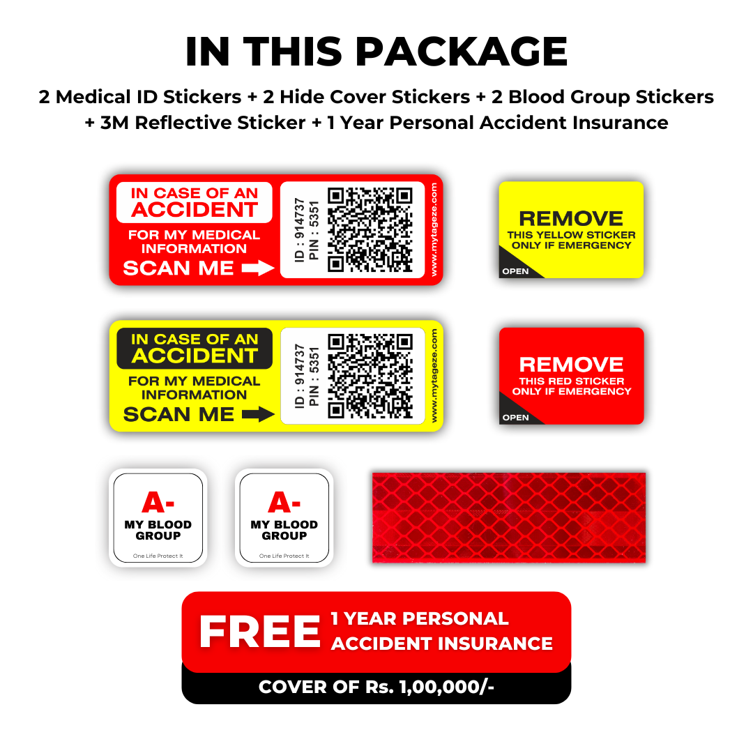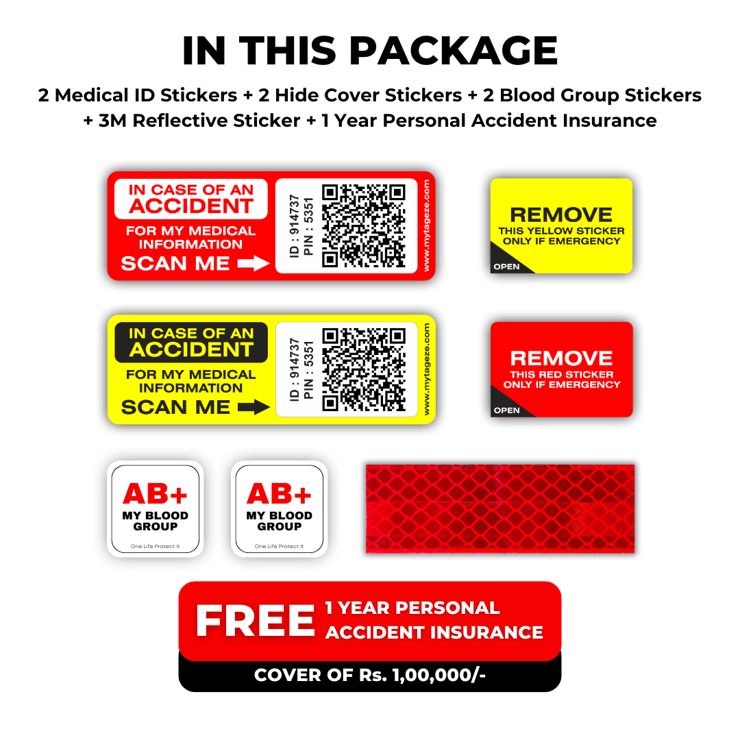 If you need Blood Group Sticker + Reflective Sticker + 1 Year Insurance with Medical ID Sticker, then below given package is for you